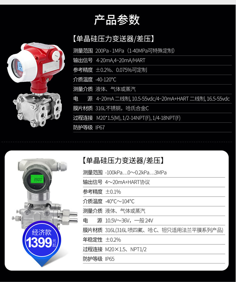 產(chǎn)品簡介:差壓安裝式表壓/絕壓變送器用于測量液體、氣體或蒸汽的液位、密度、壓力,然后將其轉(zhuǎn)變成4~20mADC HART電流信號輸出。采用先進的高精度單晶硅技術,測量精度高達0.075級,特有的雙過載保護膜設計,單向過壓高達40MPa。