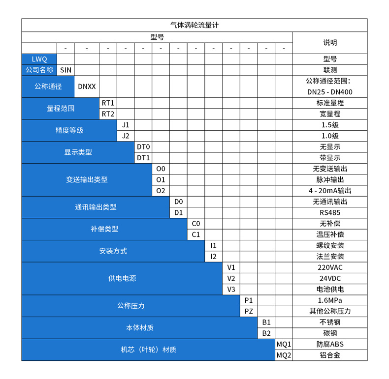 產品簡介:LWQ-SIN系列氣體渦輪流量計是集溫度、壓力、流量傳感器和智能流量積算儀于一體的新一代高精度、高可靠性的氣體精密計量儀表,具有出色的低壓和高壓計量性能。