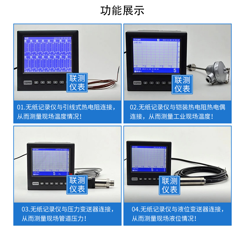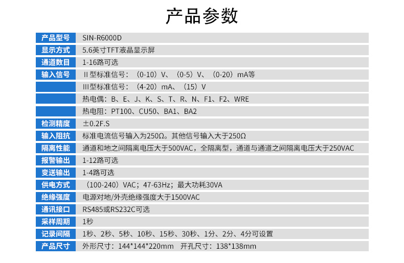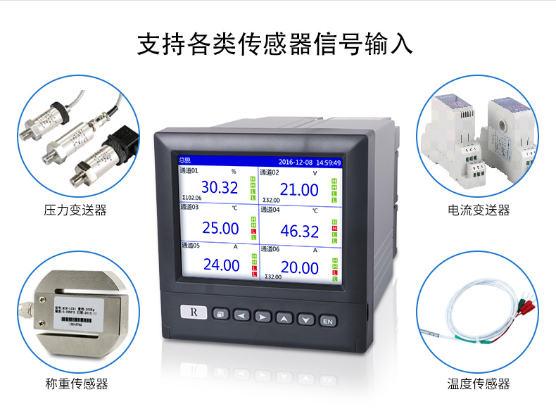 產品簡介:SIN-R6000D系列無紙記錄儀是一種高速高性能微處理器和5.6英寸彩色液晶顯示屏,對現場各種溫度、壓力、流量、電量等信號實現監測、控制和記錄功能。 SIN-R6000D系列無紙記錄儀可自由組態輸入標準電流、標準電壓、熱電偶、熱電阻、頻率等信號,可實現為傳感器配電和繼電器報警輸出,并且可通過U盤或通訊方式與上位機進行數據交換。