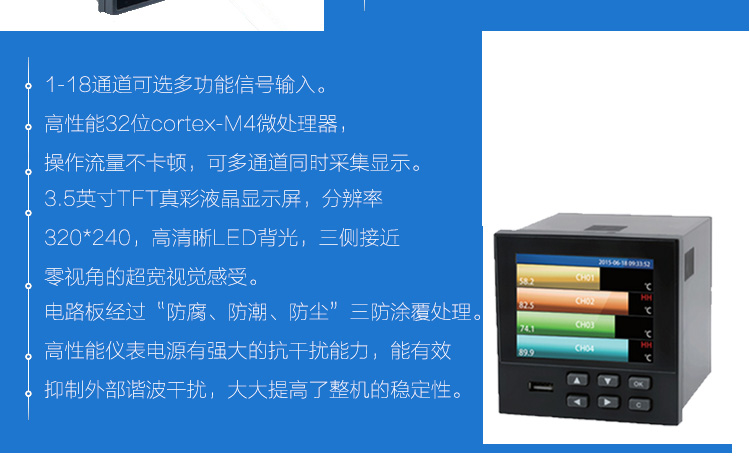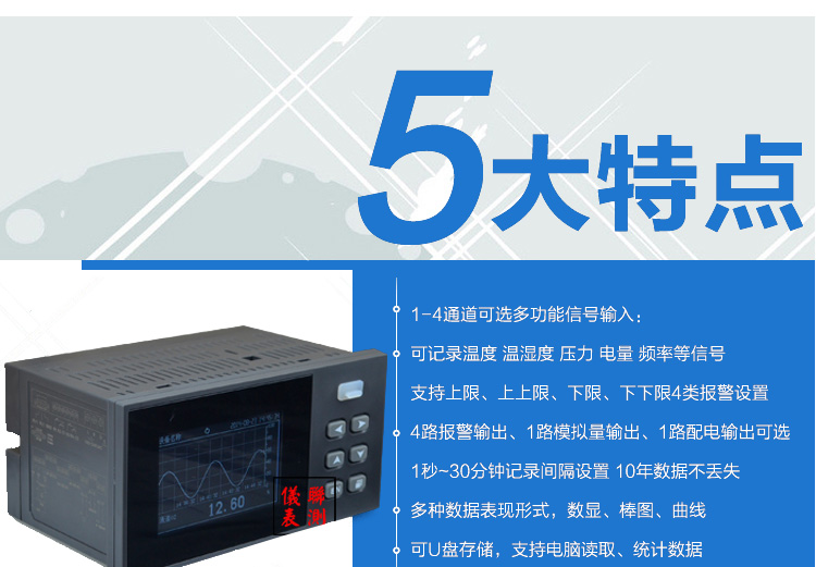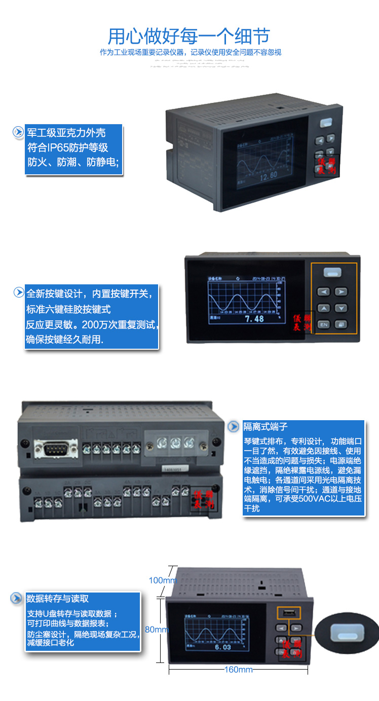 產品簡介:SIN-R200D系列無紙記錄儀可自由組態輸入標準電流、標準電壓、熱電偶、熱電阻、頻率等信號,可實現為傳感器配電和繼電器報警輸出,并且可通過U盤或通訊方式與上位機進行數據交換。無紙記錄儀 本身具有實時數據顯示畫面、曲線顯示畫面以及棒圖數據顯示畫面,同時,可以與微型打印機相連 接,實現現場打印功能,與聲光報警器連接,實現現場聲光報警功能。