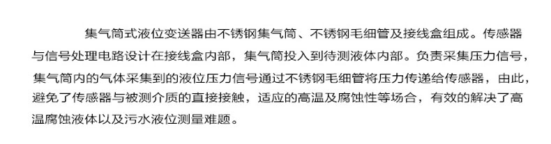 產(chǎn)品簡介:集氣桶式液位變送器(下稱變送器)用于測量較高溫度液體介質(zhì)的液位,原理是被測液體介質(zhì)壓縮集氣桶內(nèi)的空氣,空氣壓力通過毛細管傳遞給敏感元件,敏感元件本身不與被測介質(zhì)直接接觸,因此變送器可以應用在較高溫度的介質(zhì)環(huán)境中,同時,內(nèi)置微型信號放大處理電路,可以直接與計算機接口卡、控制儀表、智能儀表或 PLC 等連接,進行遠程傳輸。變送器廣泛應用于環(huán)保、水利、供水、工業(yè)過程控制、變頻供水等較高溫度介質(zhì)的液位測量。
