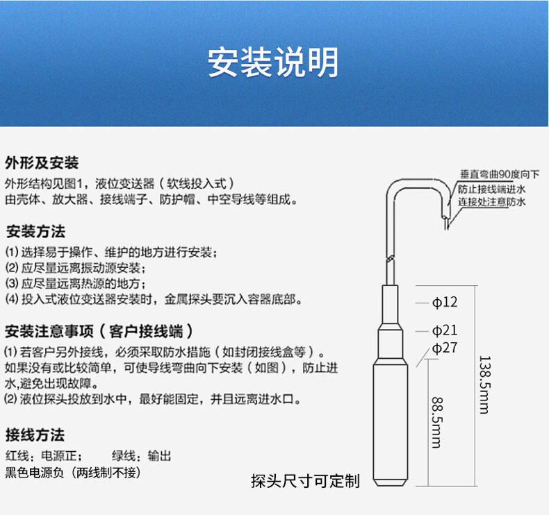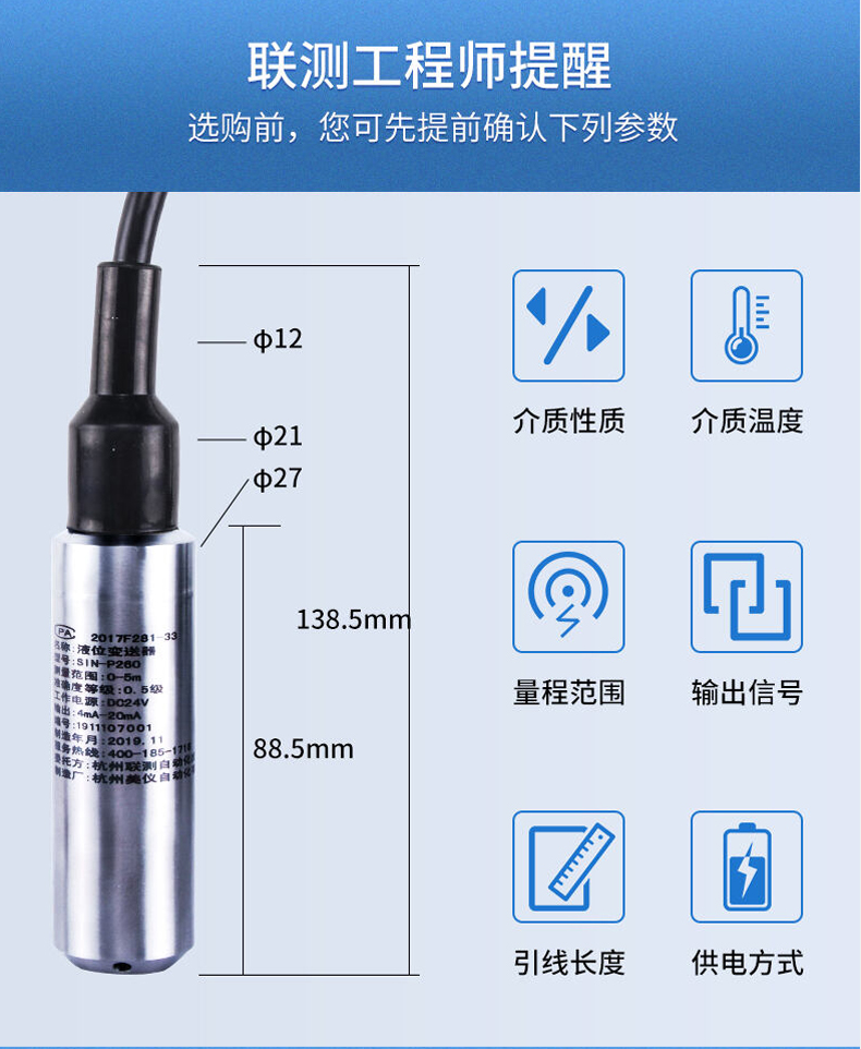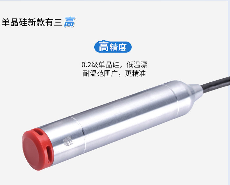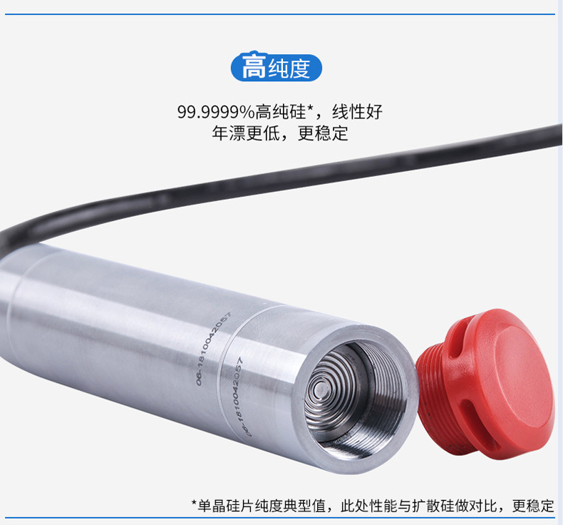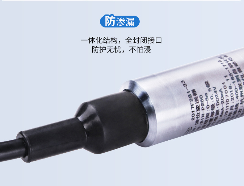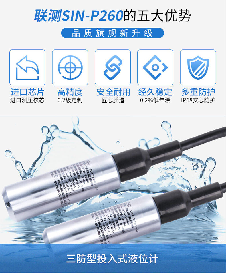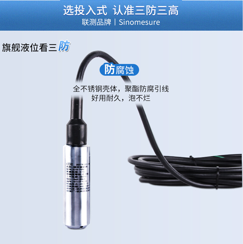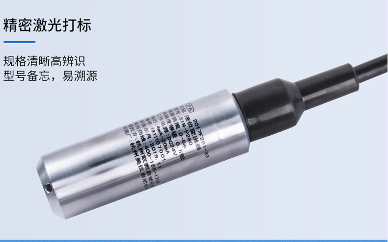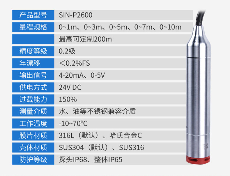 產品簡介:SIN-P260/P2600投入式液位變送器由高性能擴散硅壓阻式壓力傳感器作為測量元件,把與液位深度成正比的液體靜壓力準確測量出來,并經過信號調理電路轉換成標準(電流或電壓)信號輸出,建立起輸出信號與液體深度的線性對應關系,實現對液體深度的測量。