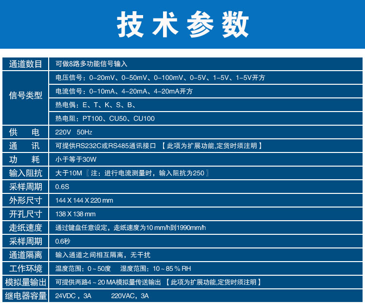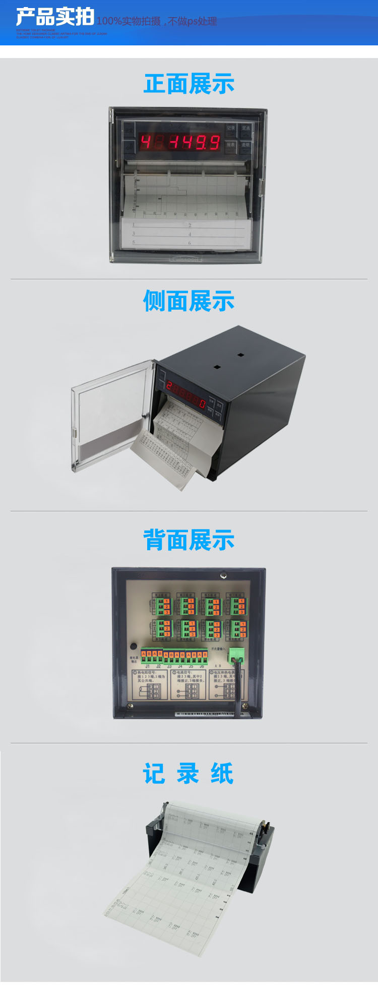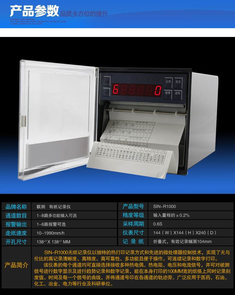 產品簡介:SIN-R1000有紙溫度記錄儀最多具有8路輸入通道,2路模擬量輸出,通道之間采用點點隔離;均可直接選擇接收多種熱電偶、熱電阻、壓力變送器、電壓、電流信號,并可對被測信號進行數字顯示及進行趨勢記錄和數字記錄,能在本身打印的120mm寬的紙格上同時記錄刻度值、時間及每一個信號的曲線,并將通道號印在各通道的軌跡旁。